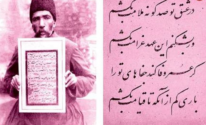 استاد خوشنویسی دربار قاجار به همراه اثر خوشنویسی با شعری از خیام