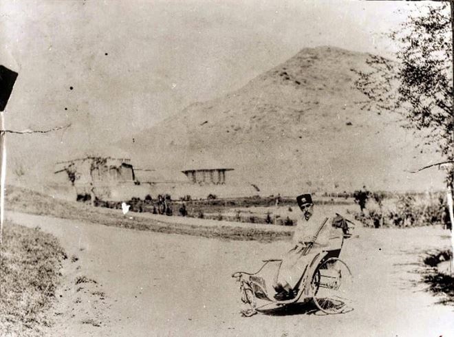 ناصرالدین شاه قاجار، سوار بر یک کالسکه سهچرخه در میان درباریانش در حیاط کاخ گلستان