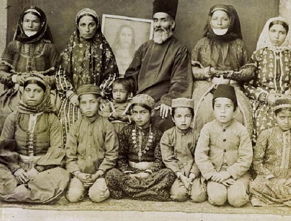 یک خانوادۀ ارمنی در ایران دوران قاجار؛ تصویر نقاشی شدۀ حضرت عیسی نیز در کنار پدر خانواده دیده می‌شود.