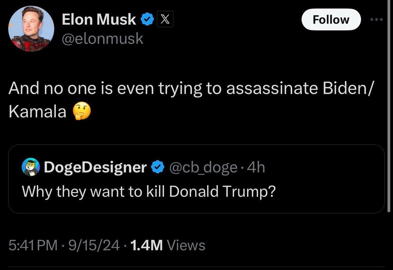 «ایلان ماسک» مالک شبکه اجتماعی ایکس در واکنش به سوء‌قصد دوباره به دونالد ترامپ، نامزد جمهوری‌خواهان در انتخابات ریاست‌جمهوری ۲۰۲۴ آمریکا با انتشار پیامی در شبکه اجتماعی ایکس نوشت که «هیچ‌کس تلاش نمی‌کند که کامالا یا بایدن را ترور کند.»