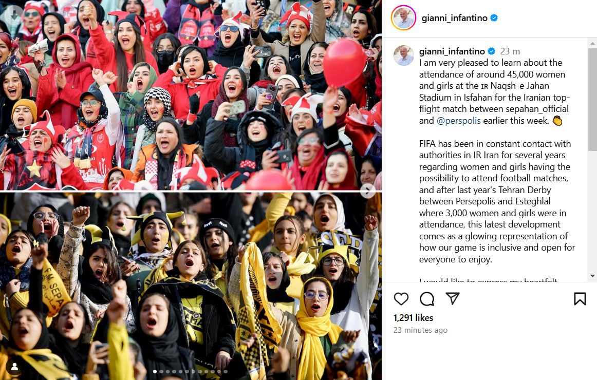 جیانی اینفانتیو رئیس فدراسیون جهانی فوتبال با تمجید از حضور ۴۵ هزار هوادار خانم در ورزشگاه برای تماشای این بازی در صفحه اجتماعی خود نوشت: مطلع شدم که در این هفته و در بازی دو تیم پرسپولیس و سپاهان حدود ۴۵۰۰۰ زن و دختر در ورزشگاه نقش جهان حضور داشتند و از این موضوع بسیار خوشحال شدم.